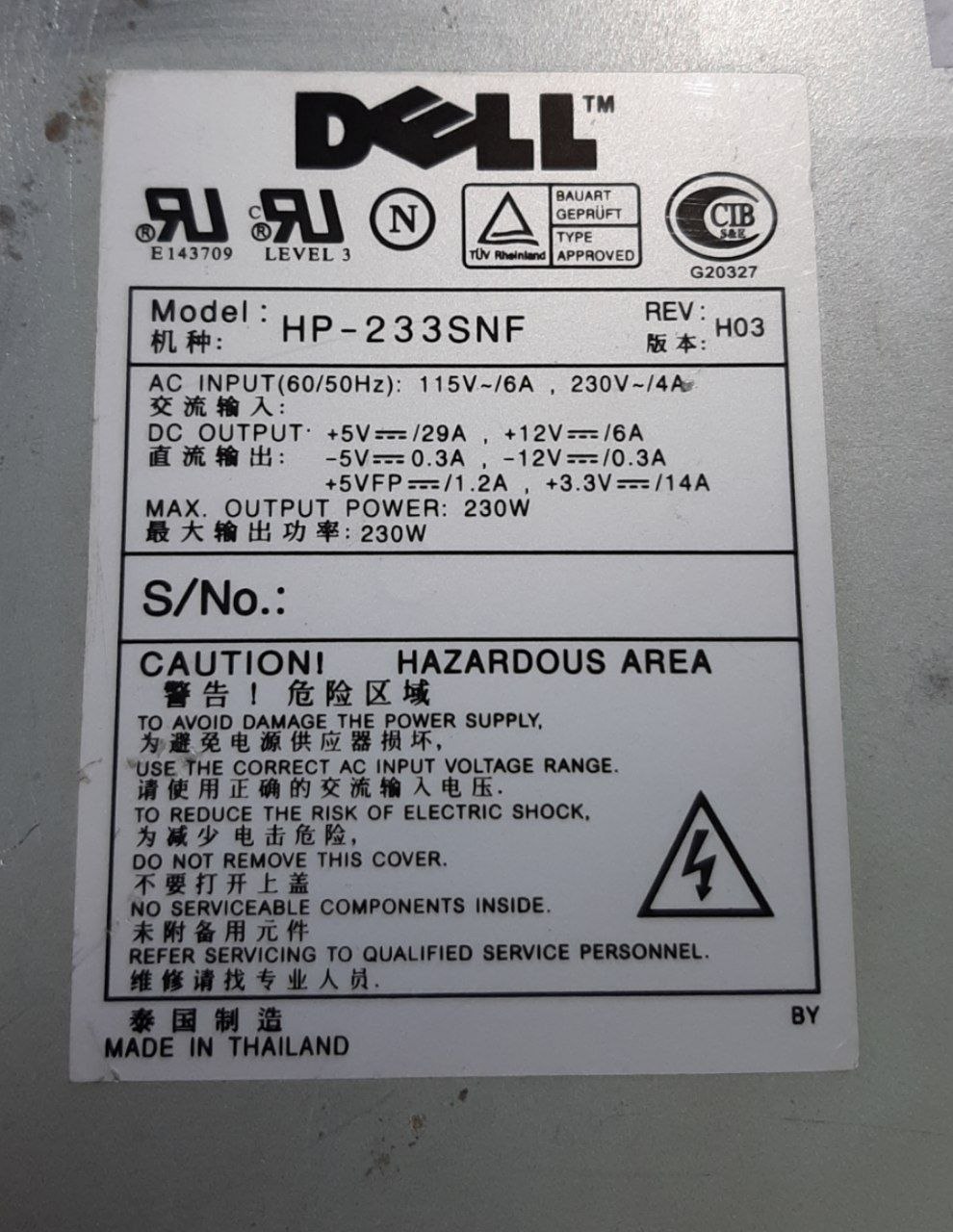 Fuente de alimentación Dell HP-233SNF de 230 W, 115 V-6 A, 130 V/4 A